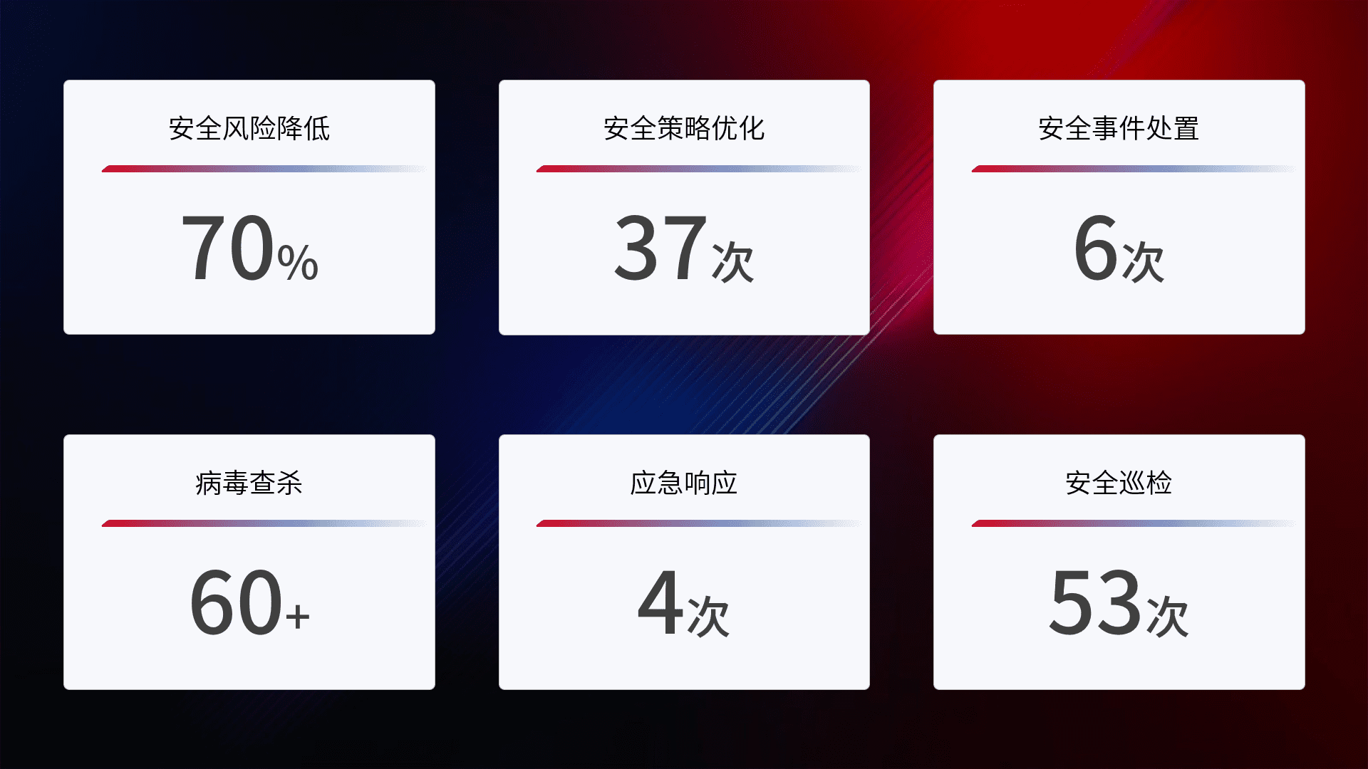 提供全面的安全事件报告体系,,,,包括处置报告、、周报、、、、季度和年度总结,,,结合持续监控,,帮助客户深入了解网络安全状况。。。。