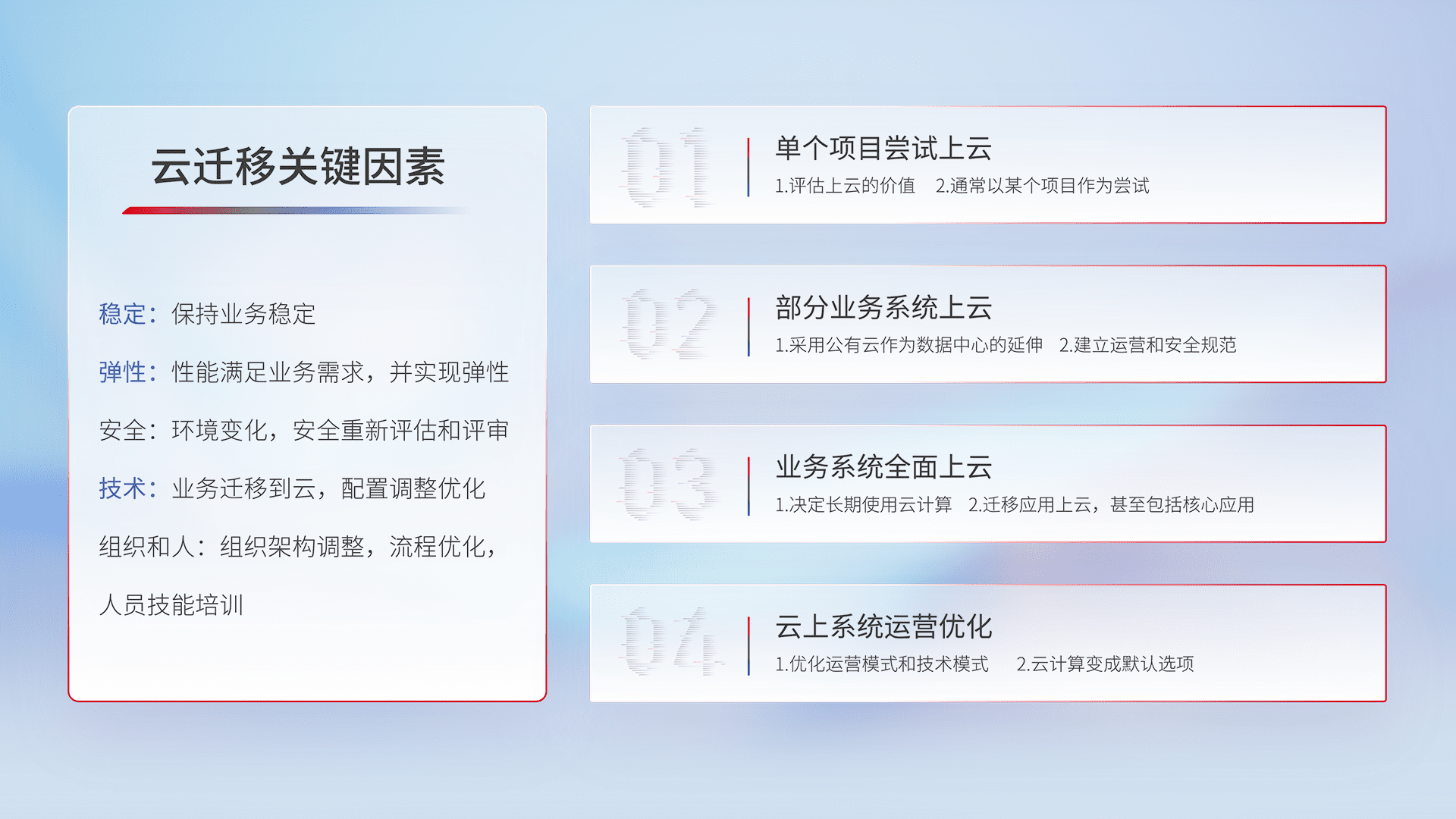 结合实际业务,,,从规划设计、、、、云平台选型、、云原生改造、、、数据迁移、、、集成交付,,,,迁移全过程为客户识别最佳上云路径,,,,做好风险识别管理,,设计网络架构、、身份权限、、、安全审计合规、、操作审计、、、日志审计、、监控告警策略、、多站点容灾设计等,,对云上基础设施进行整体规划,,,提升IT治理水平,,,,以满足弹性、、、高可用、、高性能的需求。。。