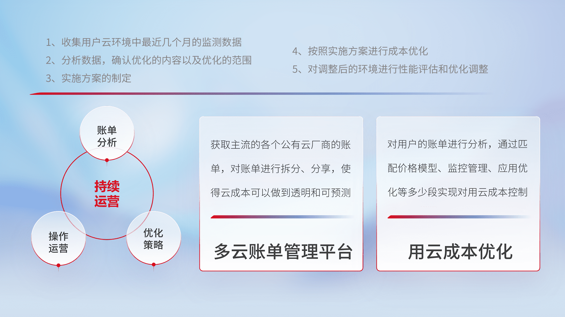 通过多云纳管,,以统一的资源数据模型把客户的云资源进行抽象和封装,,进而实现对多云资源的统一操作,,,保障云资源管理的可靠性、、稳定性与可用性。。。。量身定制化运维内容,,,,配置、、、、开发运维、、、补丁管理、、备份、、、、监控、、认证和访问管理、、、审计和日常巡检等,,,,保障在用云过程中的可靠度,,稳定度以及高可用率。。。。